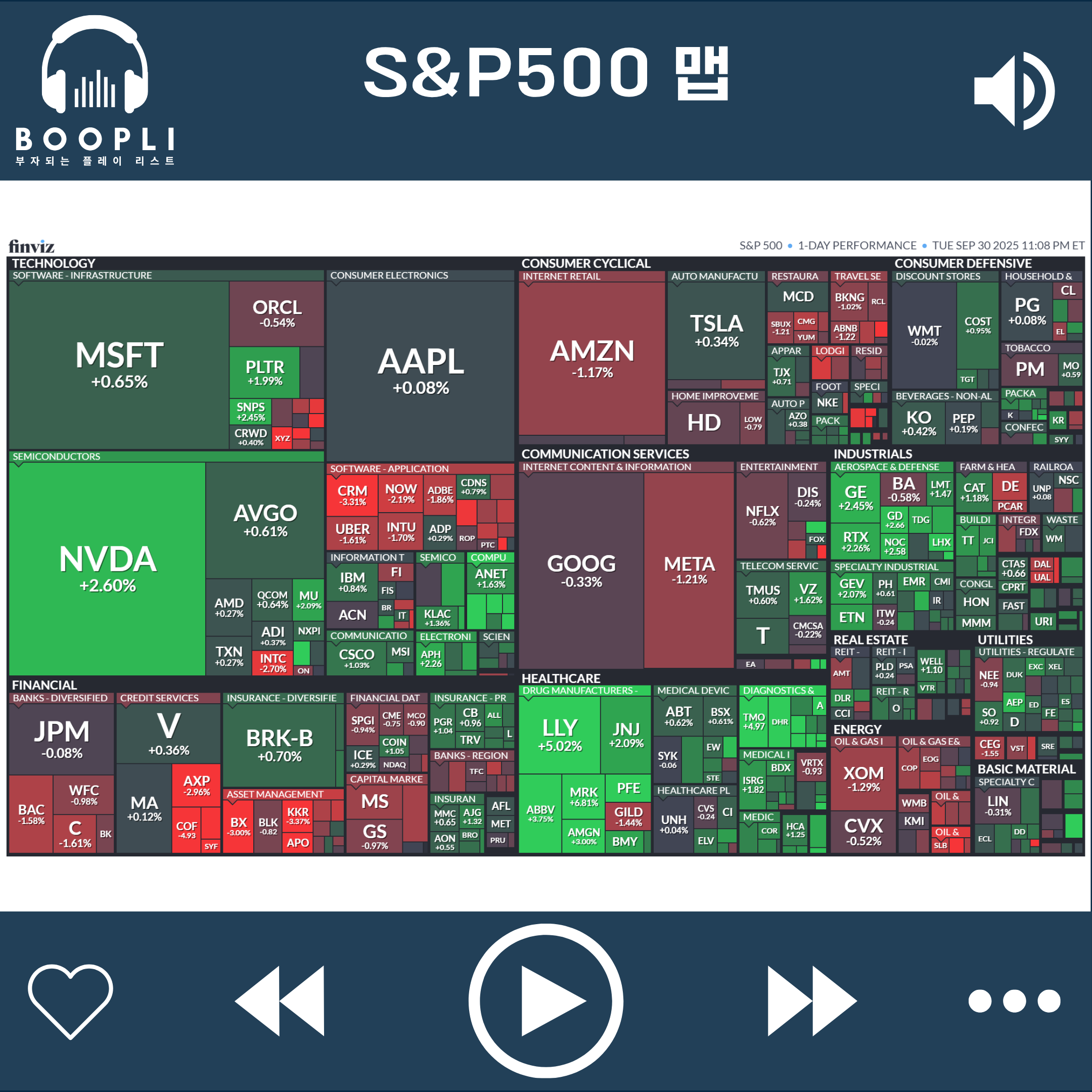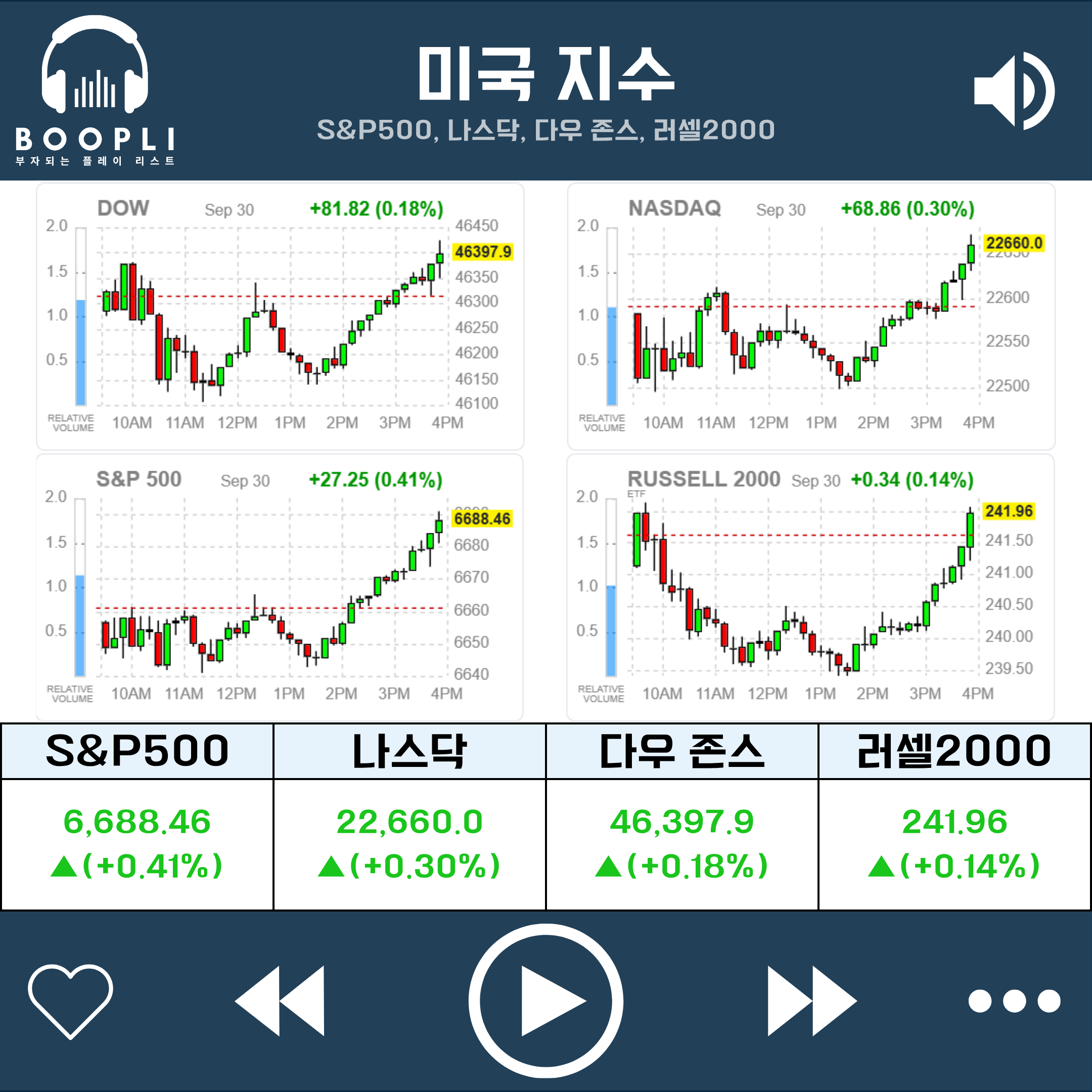 종합적으로, 전일 미국 증시는 셧다운 불확실성과 부진한 경제지표가 투자심리를 압박했지만, 연준의 완화적 정책 기대감과 분기말 리밸런싱 수급 유입이 이를 상쇄하며 주요 지수가 모두 상승세로 마감