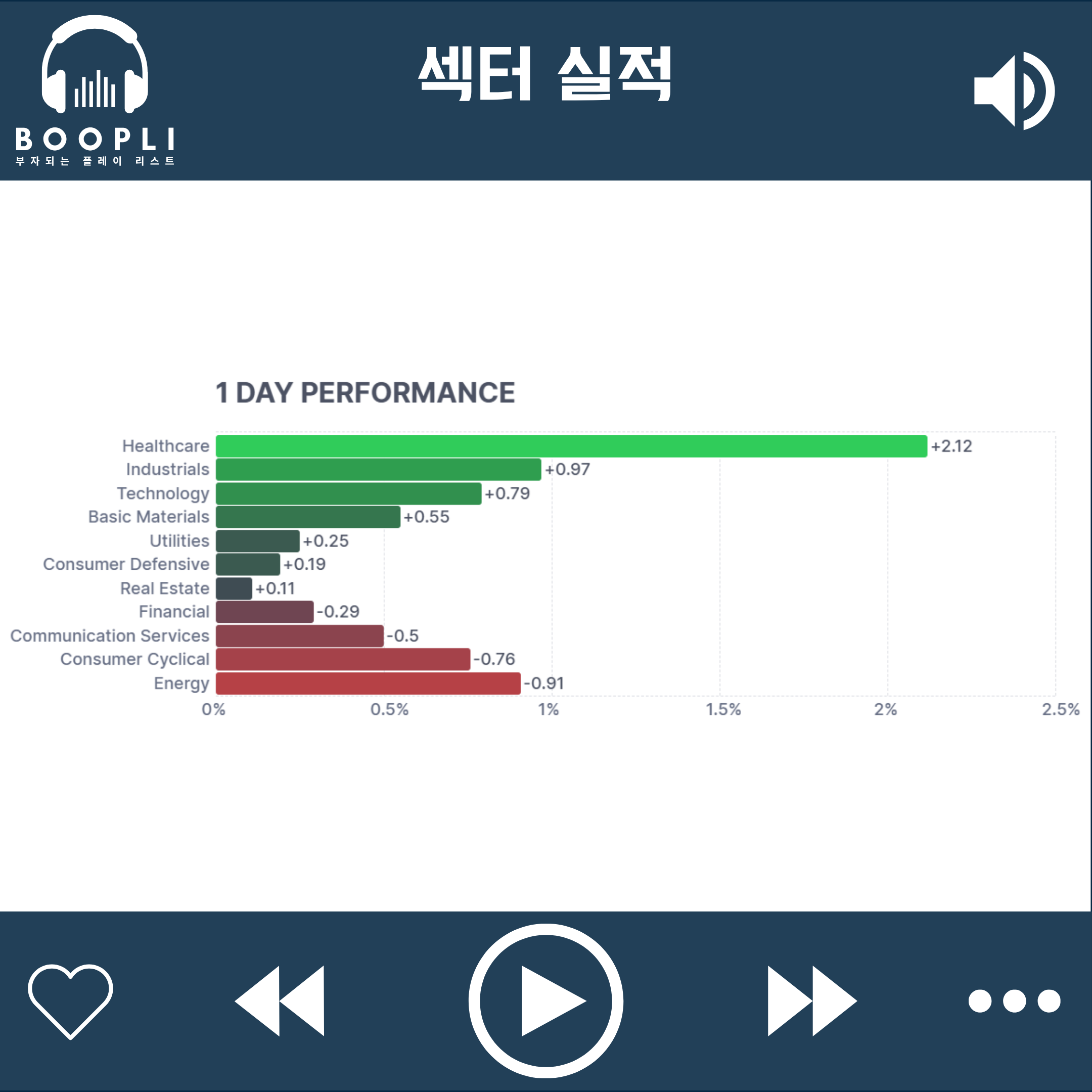 화이자의 약가 인하 협상 및 관세 유예 기간 확보로 헬스케어 섹터가 상승 주도, 이어서 산업재, 기술, 원자재 순으로 강세