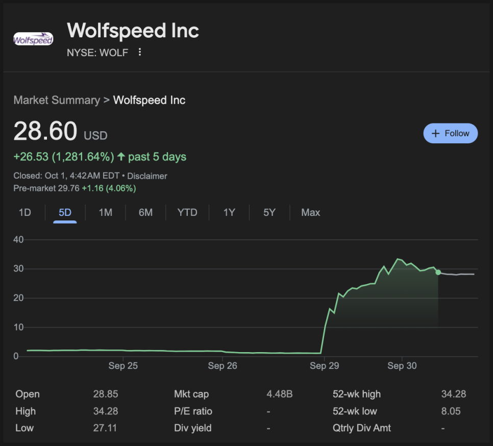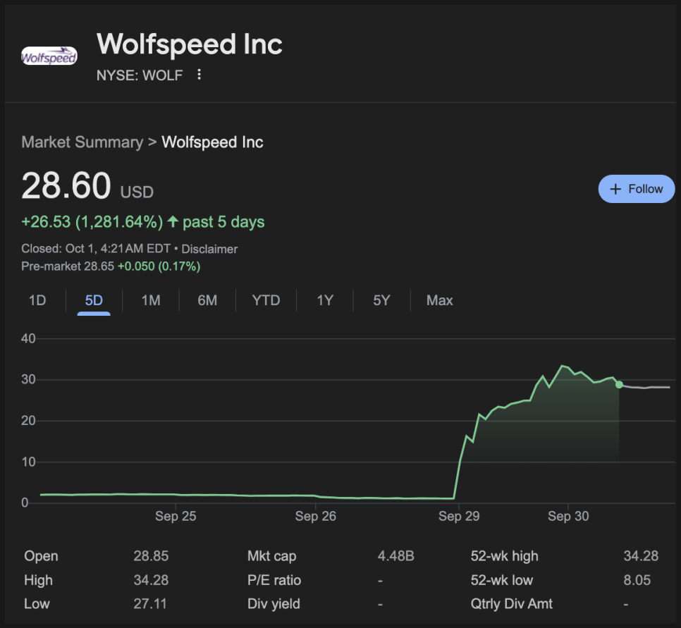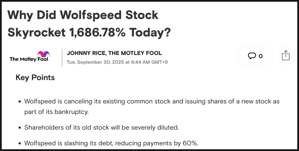 그런데 이번 사건이로 인해 울프스피드 주가가 하루 만에 1,686.78% 폭등했다는 뉴스가 헤드라인을 장식했습니다. 하지만 이는 착시 현상입니다. 기존 주식이 전부 소각되고 신주로 교체되면서 발행 주식 수가 크게 줄었는데, 일부 시장 데이터는 이를 즉시 반영하지 못했습니다. 그 결과, ‘가격이 17배나 뛰었다’는 숫자가 잡혔던 겁니다.