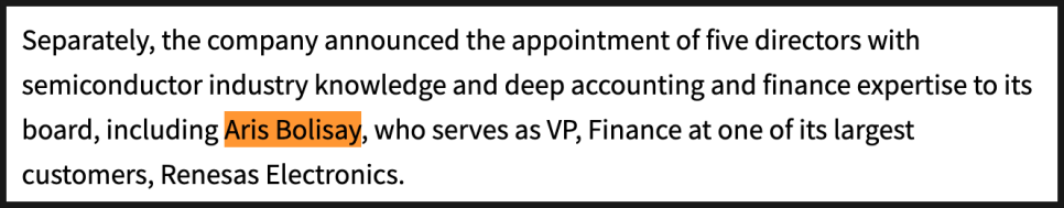 이사회에서 특히 눈길을 끄는 인사는 아리스 볼리사이(Aris Bolisay)라는 인물입니다. 그는 울프스피드의 주요 고객사 중 하나인 르네사스 일렉트로닉스의 재무 담당 부사장으로, 단순한 지배구조 개편이 아니라 고객사와의 전략적 관계를 강화하는 의미가 있습니다.
