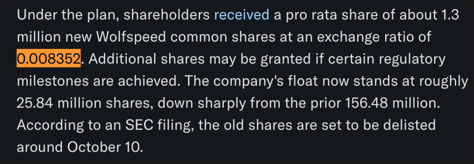 이번 과정에서 가장 큰 충격은 주식 구조였습니다. 기존에 있던 울프스피드 주식은 전부 취소되고, 새로운 주식으로 교환되었는데 교환 비율은 구주 1주당 신주 0.008352주였습니다. 특정 조건이 충족되면 조금 더 받을 수도 있지만, 사실상 기존 주주 입장에서는 지분 대부분이 사라진 셈입니다.