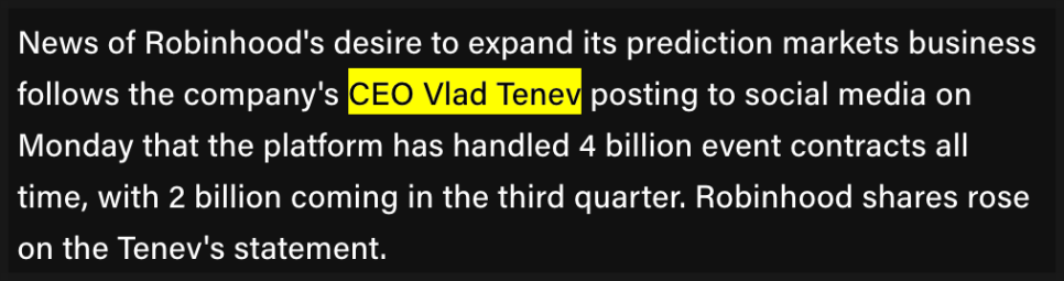 로빈후드는 영국 금융감독청(FCA) 등 해외 규제 당국과 협의하며 글로벌 확장을 준비 중입니다. CEO 블라드 테네프는 지금까지 40억 건의 예측계약이 거래됐고, 그중 절반은 올 3분기에만 이뤄졌다고 밝혔습니다. 엄청난 성장세죠.