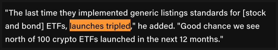 과거 일반 상장 기준이 처음 도입됐을 때, 주식과 채권 ETF 출시가 세 배로 늘어난 전례가 있죠. 이번에도 앞으로 1년 안에 100개가 넘는 암호화폐 ETF가 나올 수 있다는 전망이 나옵니다.