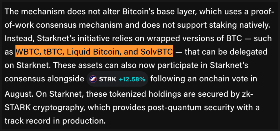 비트코인 자체는 작업증명 방식으로 운영돼서 스테이킹이 불가능합니다. 하지만 WBTC 같은 ‘랩드 비트코인’을 활용하면 다른 네트워크에서 쓸 수 있는데요. 스타크넷은 이 토큰화된 비트코인을 네트워크 보안 과정에 참여시켜 보유자가 보상도 받을 수 있도록 설계했습니다.