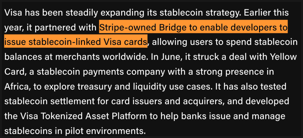 비자는 이미 여러 시도를 해왔습니다. 스트라이프 산하 브리지와 제휴해 스테이블코인 기반 비자 카드를 발급할 수 있게 했고, 아프리카 지역에서는 옐로우 카드라는 회사와 함께 국경 간 결제 솔루션을 연구했습니다. 또 은행들이 자체 스테이블코인을 발행해 실험할 수 있는 플랫폼도 만든 상태입니다.