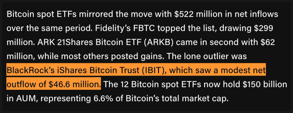 흥미롭게도 블랙록의 IBIT에서는 4,600만 달러 정도가 빠져나갔지만, 전체적으로 비트코인 ETF가 보유한 자산은 1,500억 달러에 달합니다. 이는 전체 비트코인 시가총액의 6.6%에 해당하는 수준이죠.
