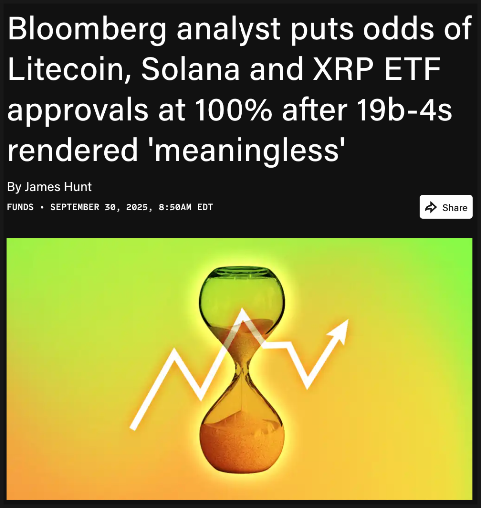 블룸버그의 ETF 애널리스트 에릭 발추나스는 라이트코인, 솔라나, 리플 같은 ETF의 승인 가능성이 “이제는 100%”라고 단언했습니다. 이유는 간단합니다. SEC가 ‘일반 상장 기준’을 도입했기 때문인데요. 나스닥이나 뉴욕증권거래소 같은 곳에서 일정 요건을 충족하면 별도의 승인 없이 ETF를 상장할 수 있게 된 겁니다.