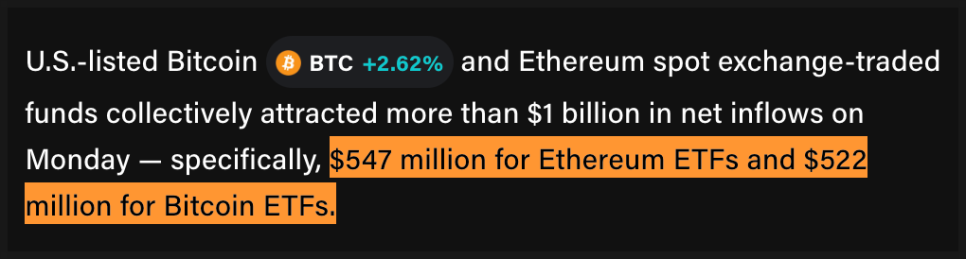 월요일 하루 동안 미국 증시에 상장된 비트코인과 이더리움 현물 ETF에 들어온 자금이 10억 달러를 넘었습니다. ETF라는 것은 주식처럼 거래되지만 실제로는 특정 자산의 가치를 추종하는 펀드 상품인데요. 현물 ETF는 말 그대로 실제 자산을 보유하고 있기 때문에 기관 투자자들에게 특히 매력적인 상품입니다.