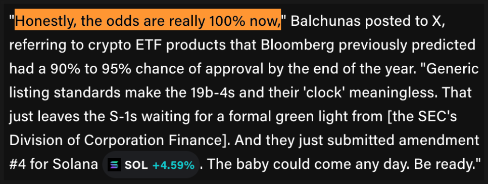 이 말은 곧, 당초 10월에나 가능할 것 같던 새로운 ETF들이 사실상 언제든 출시될 수 있다는 뜻입니다. 이미 코인베이스 파생상품 시장에서 라이트코인, 솔라나, 리플 같은 자산의 선물 계약이 거래되고 있기 때문에 자격 요건은 충족된 상태입니다.