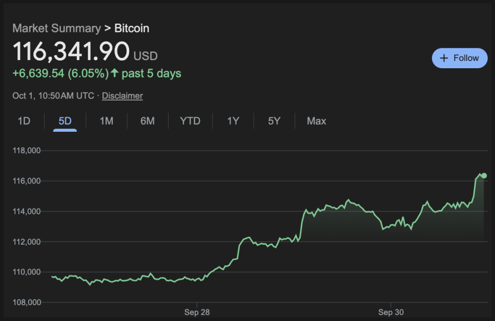 참고로 지난 주말부터 꿈틀거리기 시작하더니 비트코인 가격은 지난 5일 간 6% 상승했습니다.