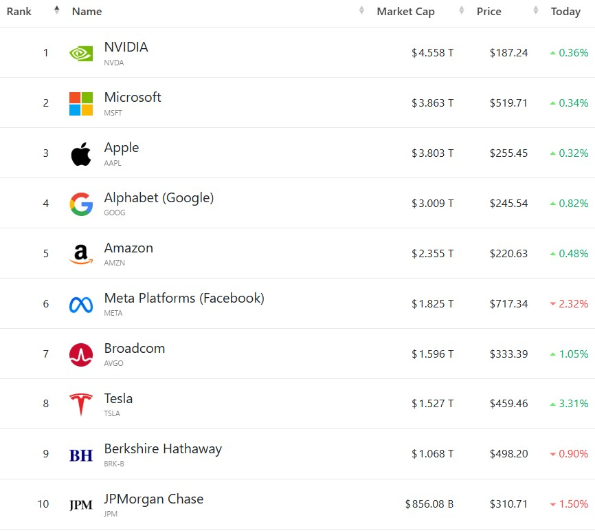 이날도 AI 및 반도체 관련 기술주들이 미국 증시를 이끌었는데요. 엔비디아는 전일 대비 +0.35%, 마이크로소포트 +0.34%, 애플 +0.32%, 아마존 +0.48%, 알파벳 +0.82% 그리고 테슬라는 +3.31% 큰 폭으로 상승 마감하였습니다. 유일하게 메타 플렛폼만 전일 대비 -2.32% 하락하면서 거래를 마쳤습니다.