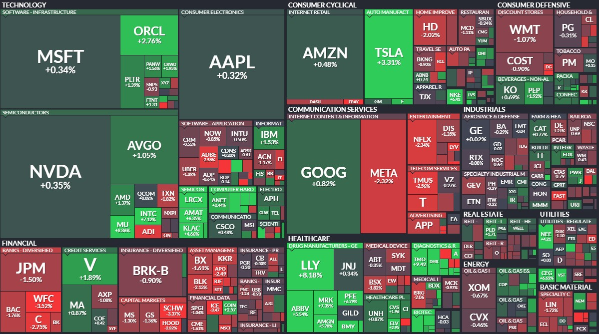 다우지수는 전일 대비 +0.09% 오른 46,441.10에 거래를 마쳤으며, 대형주 중심의 S&P500 지수는 전장 대비 +0.34% 상승한 6,711.20에 장을 마감하였습니다. 기술주 중심의 나스닥 지수는 전 거래일 대비 +0.42% 오른 22,755.16에 거래를 마치며 장을 마감하였습니다.