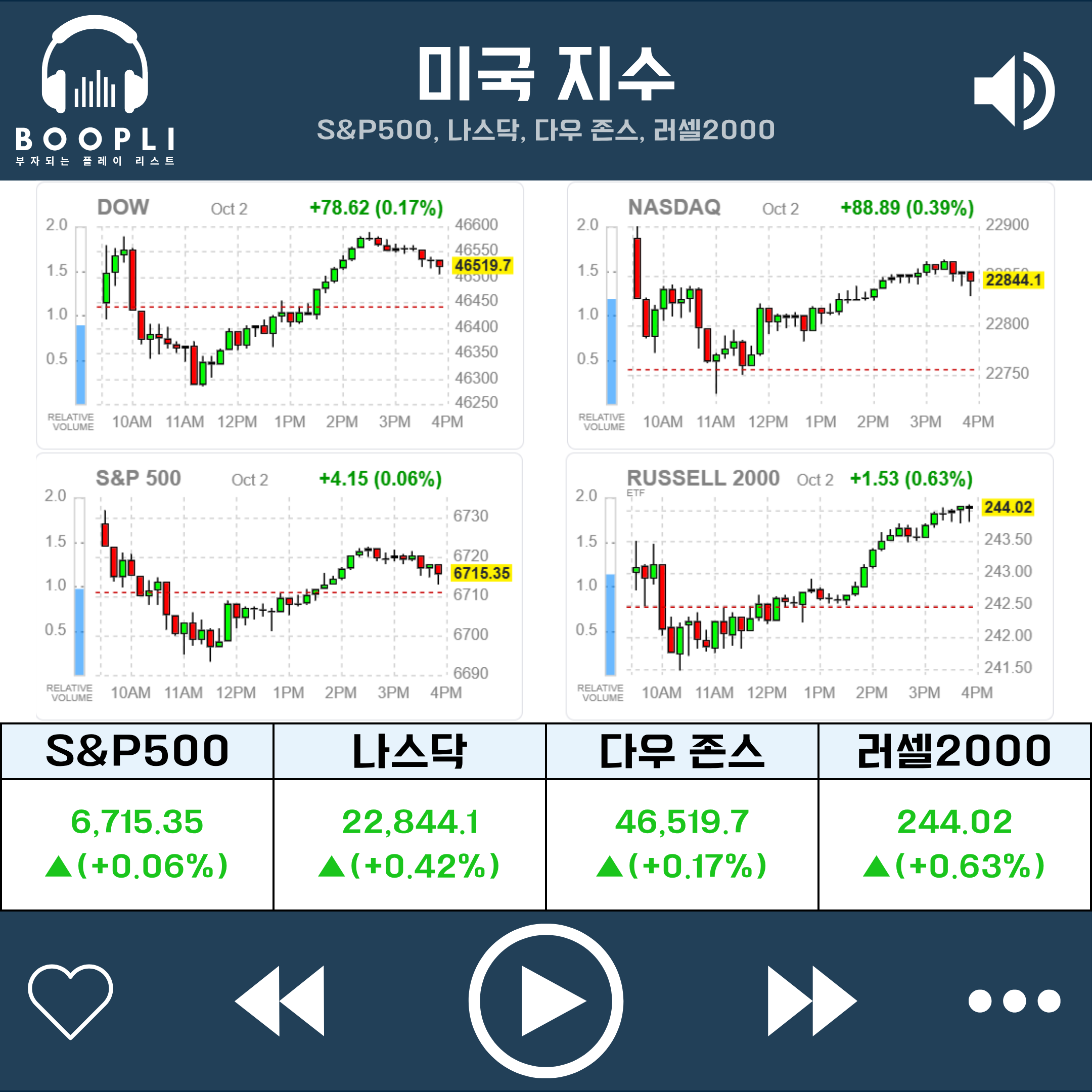 전일 미국 증시는 연방정부 셧다운 장기화와 고용 불안 우려에도 불구하고 기술주 강세에 힘입어 3대 지수 모두 사상 최고치를 경신했으며, 중소형주 중심의 러셀2000도 상승 마감