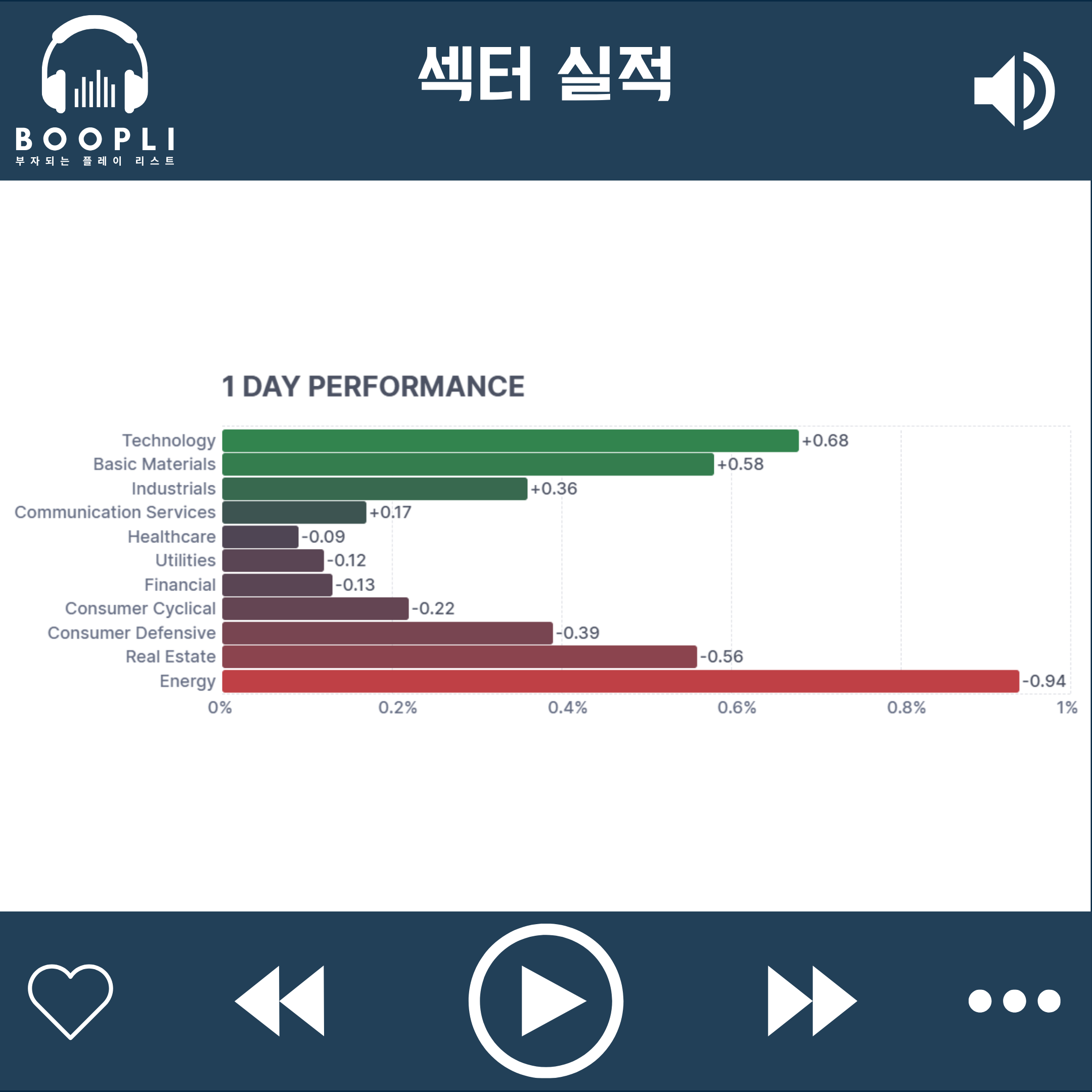 산업재, 커뮤니케이션 서비스 섹터는 강보합, 경기 방어주, 소비 순환재, 금융, 유틸리티, 헬스케어 섹터는 약보합 마감