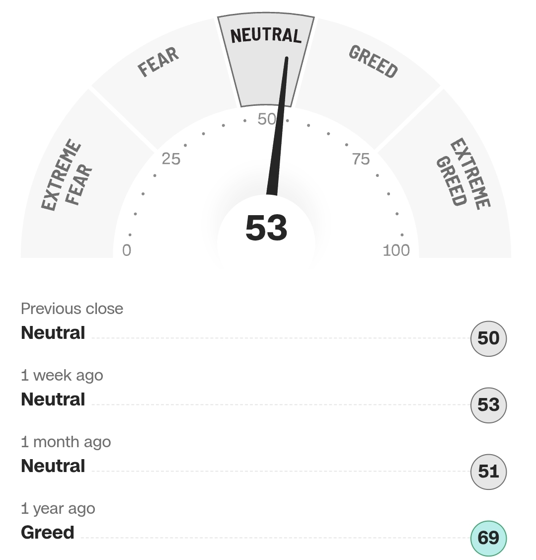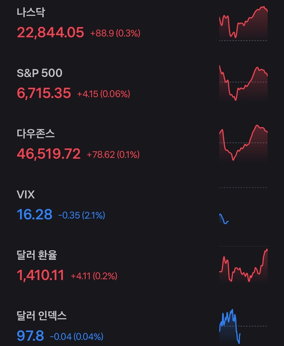 미국 주요 지수는 소폭 상승으로 마감했습니다. 나스닥은 +0.3%, S&P 500은 +0.06%, 다우지수는 +0.1%를 기록했으며 VIX는 16.28로 안정적인 수준까지 내려왔습니다. 원·달러 환율은 1,410원대로 다시 상승하며 외환시장의 변동성이 확대되는 모습입니다. 달러 인덱스는 97.8로 약세 흐름을 이어가고 있으며 이는 글로벌 매출 비중이 높은 기업들에 긍정적으로 작용하고 있습니다. 시장 심리를 보여주는 공포·탐욕 지수는 53으로 ‘중립’을 유지하고 있어 단기 과열이나 극단적 공포는 나타나지 않고 있습니다.