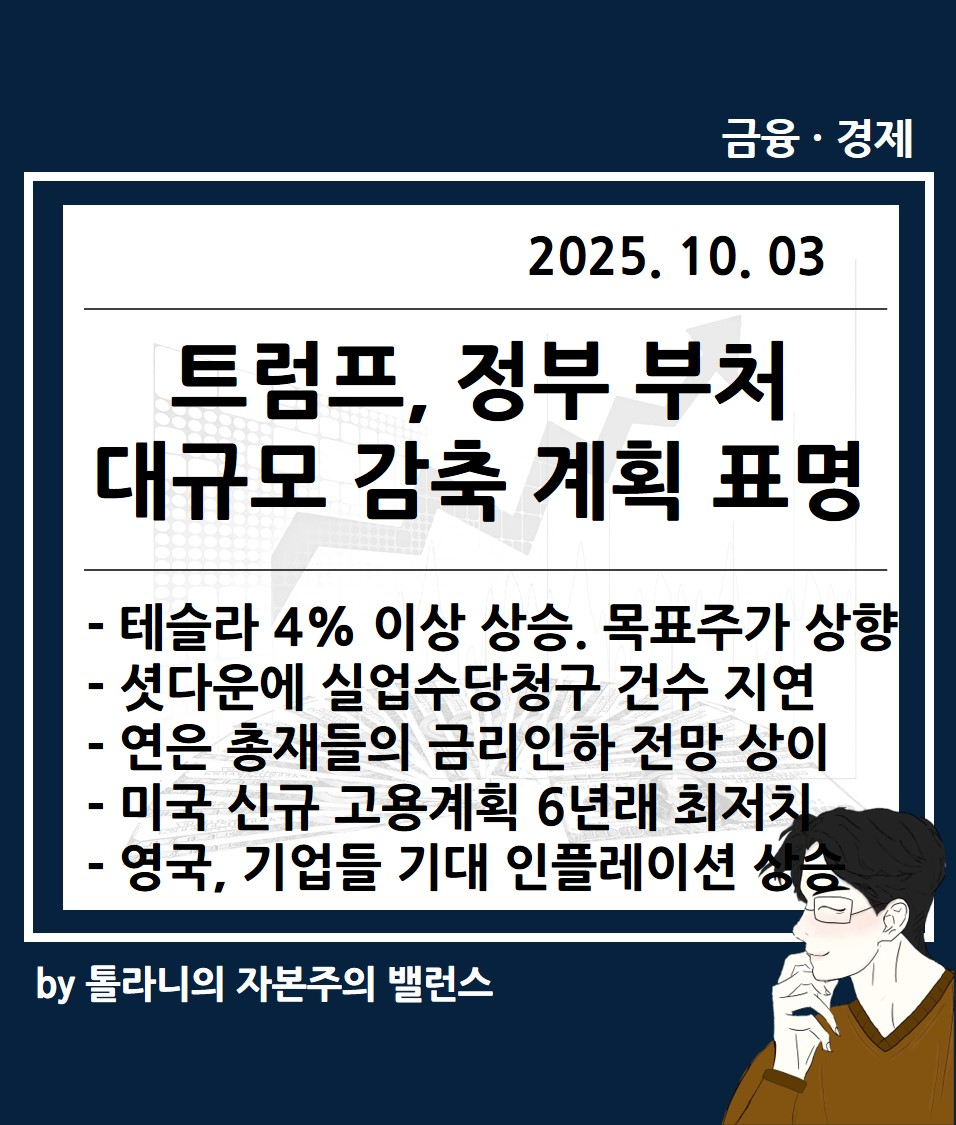 지금까지 '트럼프, 정부 부처 대규모 감축 계획 표명. 셧다운 실업수당청구 건수, 고용지표 지연 등 주요 국가 경제·금융 동향' 관련하여 알아보았는데요.
