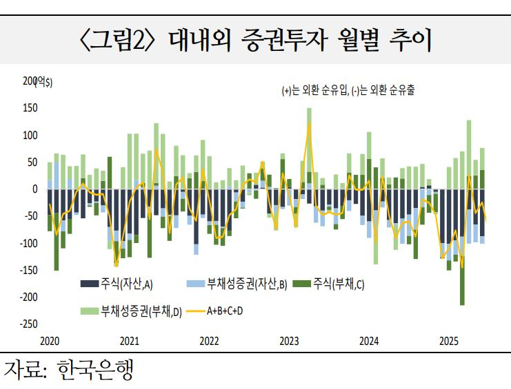 내국인의 해외 증권투자 둔화($101.0억 → $84.1억)에도 불구하고, 외국인의 국내 증권투자가 크게 둔화($76.4억 → $2.9억)되며 순유출 확대