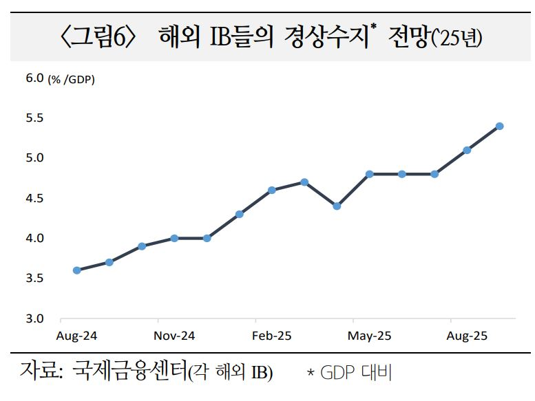 * 해외 IB들의 `25년 전망치(평균)는 8월말 5.1% 흑자(GDP 대비)에서 9월말 5.4% 흑자로 상승