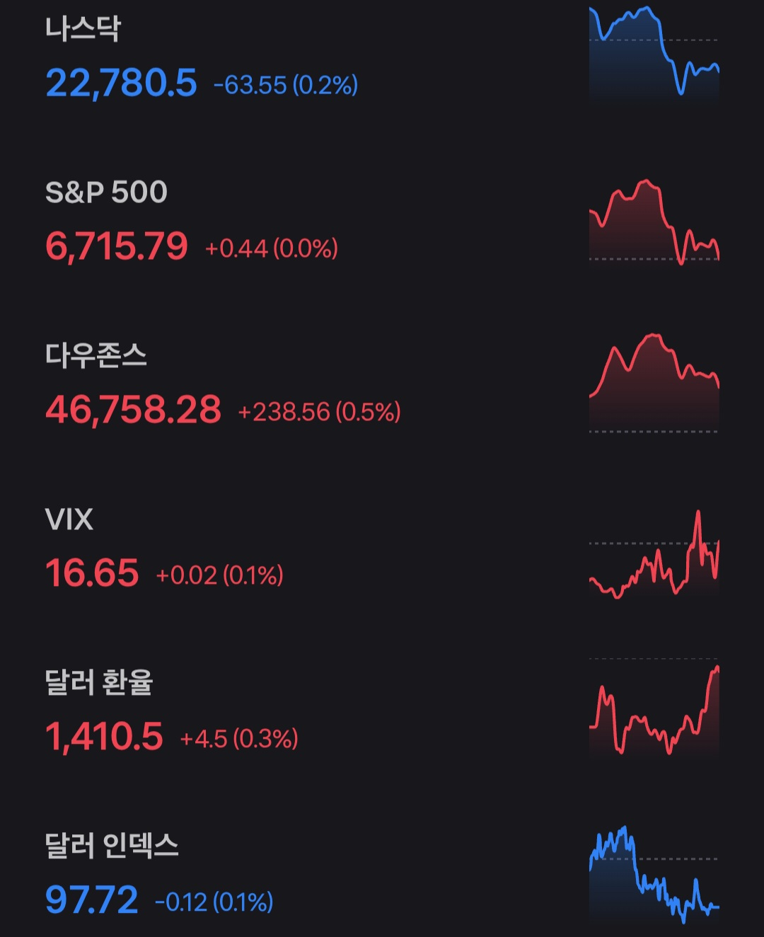 다우지수와 S&P500은 사상 최고치 갱신을 이어갔지만 기술주의 조정이 시장 불안을 드러냈습니다. VIX는 16선에서 안정적이지만 달러 환율은 1,410원으로 상승세를 이어가며 신흥국 자금 흐름에 부담이 되고 있습니다. 공포·탐욕 지수는 54로 중립을 나타내며 투자자 심리가 관망세로 전환되었습니다.