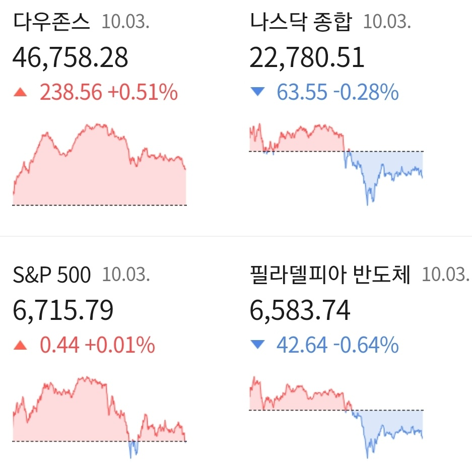 다우지수는 전일 대비 +0.51% 상승한 46,758.28에 장을 마감하였으며, 대형주 중심의 S&P500 지수는 전장 대비 +0.01% 오른 6,715.79에 거래를 마쳤습니다. 기술주 중심의 나스닥 지수는 전 거래일 대비 -0.28% 하락한 22,780.51에 거래를 마치며 장을 마감하였습니다.