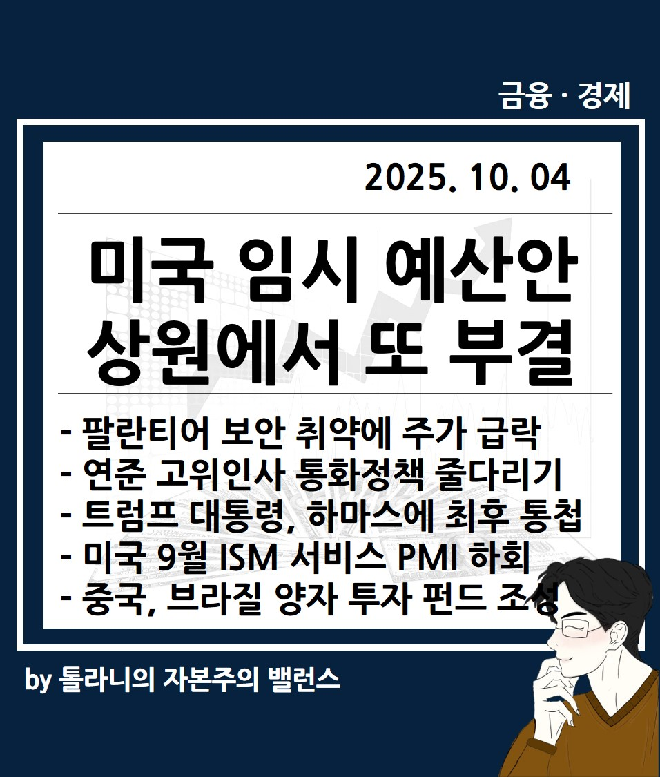 지금까지 '미국 임시 예산안 또 부결, 팔란티어 주가 급락 등 뉴욕 증시 및 주요 국가 경제·금융 동향' 알아보았는데요.