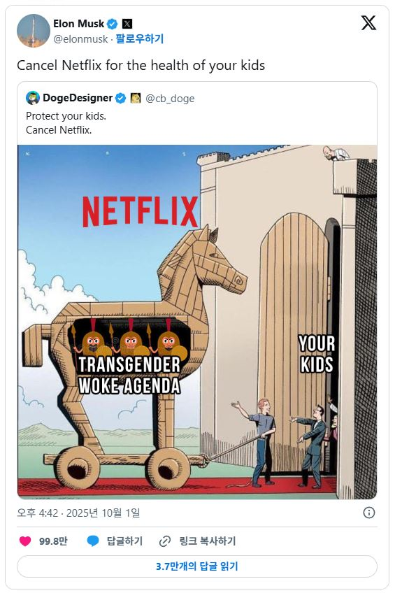 ● 일론 머스크가 넷플릭스 구독을 취소하고, X플랫폼 서비스에서 팔로워 2억 2,700만 명에게 넷플릭스 구독을 취소할 것을 촉구하며, 어린이용 쇼에서 트랜스젠더 메시지를 퍼뜨린다고 비난하며 보이콧을 촉구하는 목소리가 높아지고 있는 가운데 이 소식이 X를 통해 전해졌습니다.