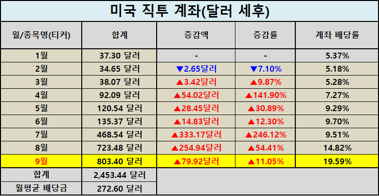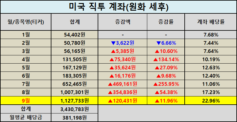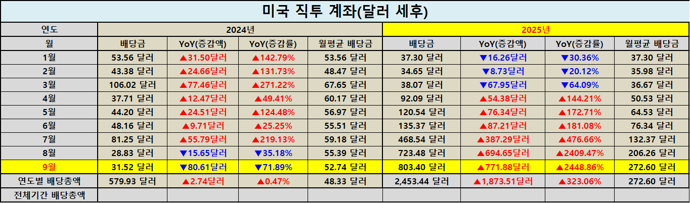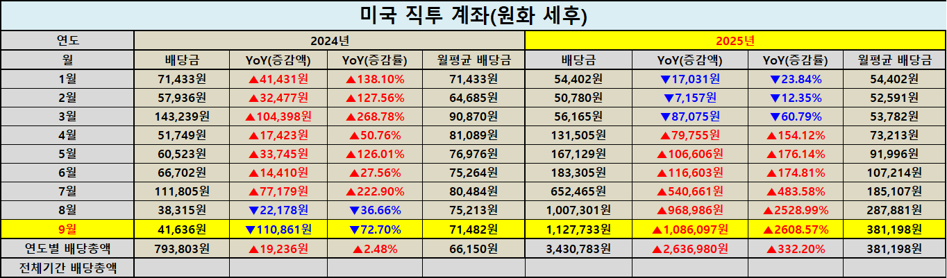 달러 기준 미국 직투 계좌의 9월 배당이 803.40달러였고 원화 기준으로는 1,127,733원이 들어왔다는 점을 함께 보면 환율 노출을 유지한 채 배당 자체가 커졌다는 사실을 동시에 확인할 수 있습니다.