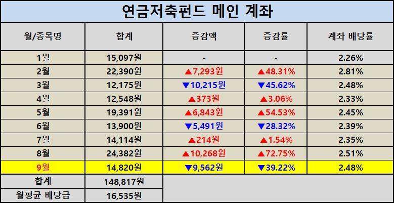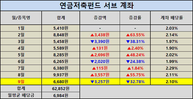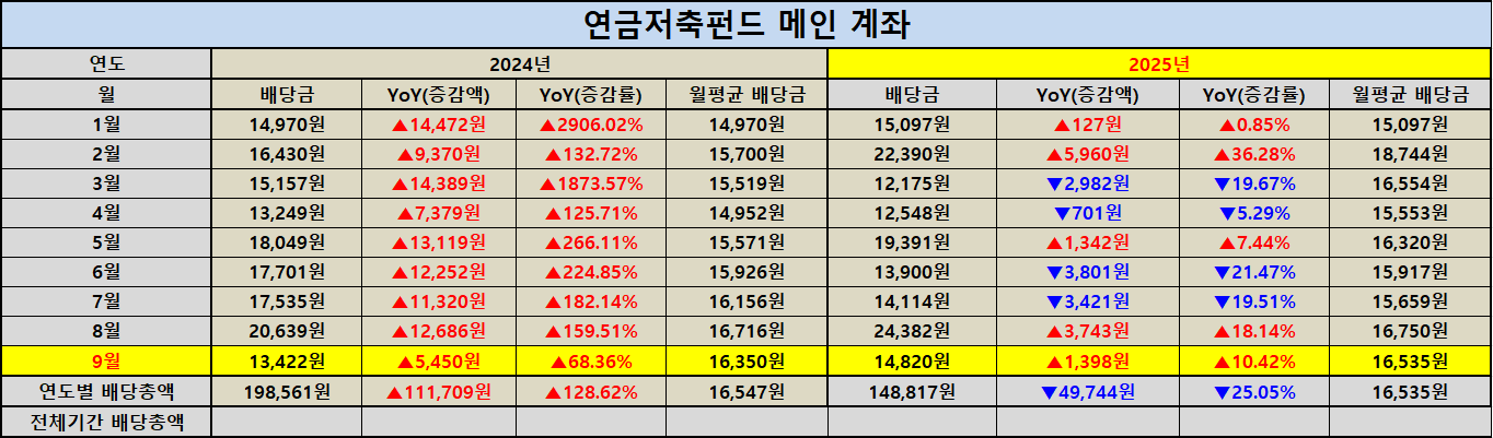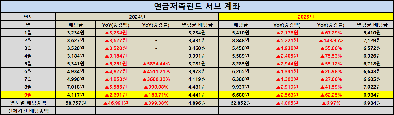 연금저축펀드 메인 계좌의 9월 배당금은 14,820원입니다. 전월 대비로는 39.22% 감소했지만 전년 동기 대비로는 1,398원 증가해 10.42% 성장했습니다. 올해 1~9월 누적은 148,817원이며 월평균은 16,535원입니다. 동일한 연금저축 서브 계좌는 6,680원을 기록했고 전월 대비 32.78% 감소했으나 전년 동기 대비 2,563원 늘어 62.25% 성장했습니다. 올해 누적 62,852원, 월평균 6,984원으로 메인보다 규모는 작지만 증가율이 높다는 점이 특징입니다.