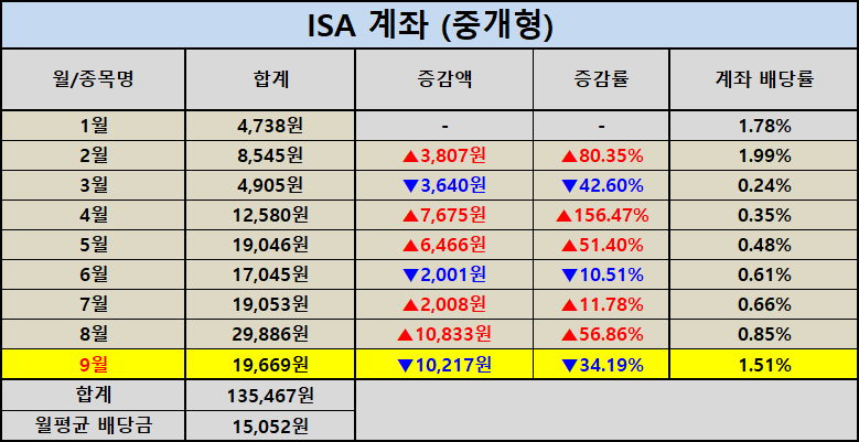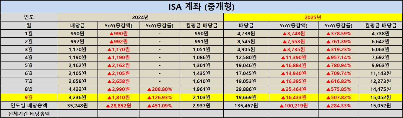 ISA 절세 계좌는 9월 19,669원을 수령했습니다. 전월 대비 34.19% 감소했으나 전년 동기 대비 16,433원이 늘어나 507.82%라는 높은 증가율을 보였습니다. 연초 이후 누적 135,467원, 월평균 15,052원으로 절세계좌의 복리 발판이 안정적으로 쌓이고 있습니다.