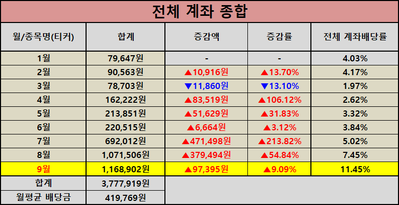 이번 달 합산 배당금은 1,168,902원입니다. 전월 대비로는 9.09% 증가했고 전년 동기 대비로는 1,106,491원이 늘어나 1,772.92%의 큰 폭 상승을 기록했습니다. 올해 누적 배당금은 3,777,919원, 올해 월평균 배당금은 419,769원으로 집계되어 연간 현금흐름의 바닥이 두터워지는 흐름을 확인했습니다.