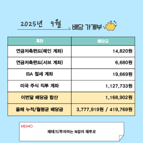 오늘은 2025년 9월 배당 가계부를 정리합니다. 한 달 동안 각 계좌에서 들어온 현금흐름을 표로 모아보니 장기간 이어온 적립과 재투자가 배당금 숫자로 서서히 드러나고 있네요. 이번 글은 계좌별 현황, 전년 대비 변화, 재투자 계획까지 한 번에 정리했습니다.