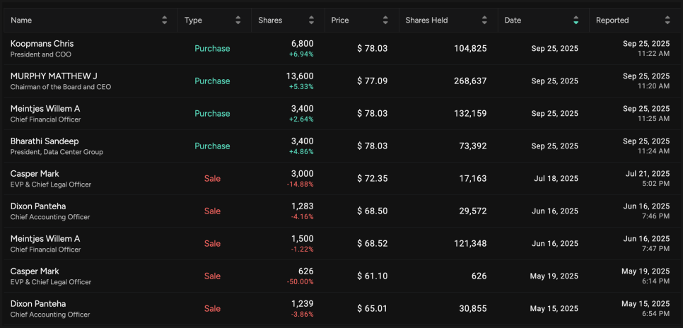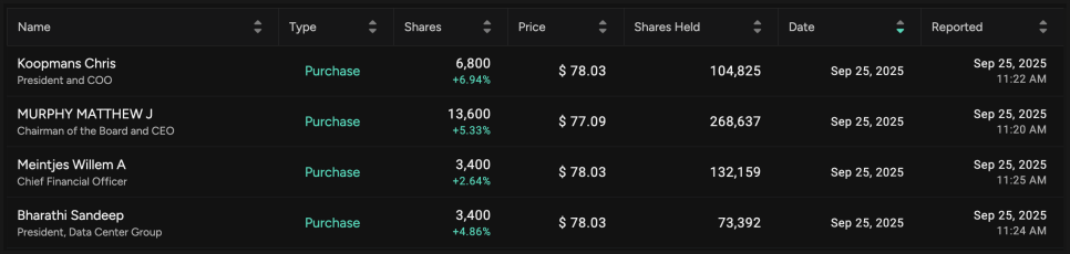 최근 마벨 테크놀로지는 투자자들의 기대감을 불러일으키는 이슈가 하나 나왔습니다. 바로 지난 9월 말, 마벨 최고경영자(CEO), 최고재무책임자(CFO), 그리고 두 명의 핵심 임원이 회사 주식을 직접 매수했다는 소식이 전해진 것인데요. 매수 가격은 주당 약 77~78달러 선이었는데, 실적 발표 직후 기록적인 매출과 이익을 보여준 상황에서 이뤄진 결정이라 더욱 주목을 받았습니다. 임원들이 개인 자금을 수백만 달러 규모로 투입했다는 사실 자체가 시장의 눈길을 끌 수밖에 없었죠.