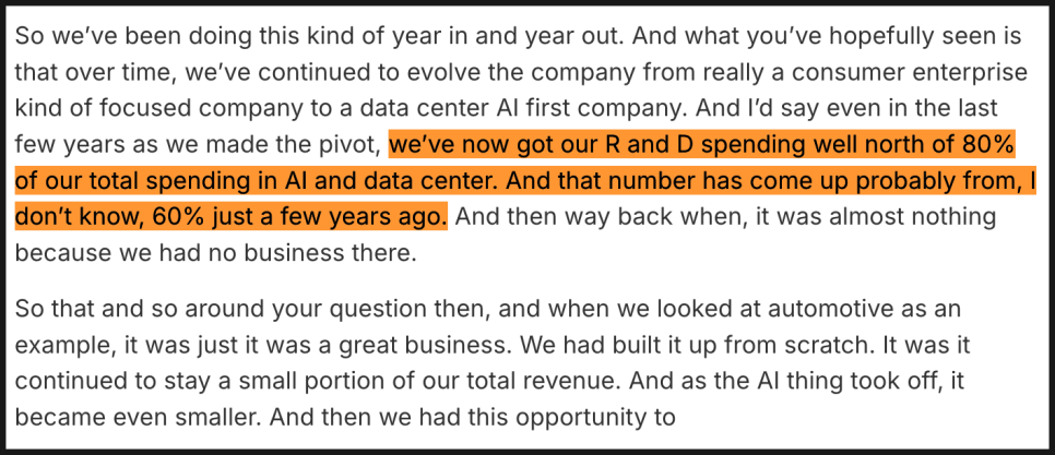 머피 CEO는 이미 연구개발 비용의 80% 이상이 AI와 데이터 센터에 쓰이고 있다고 강조했습니다. 불과 몇 년 전만 해도 60% 수준이었는데, 이제는 거의 전사적 집중을 하고 있는 셈입니다.