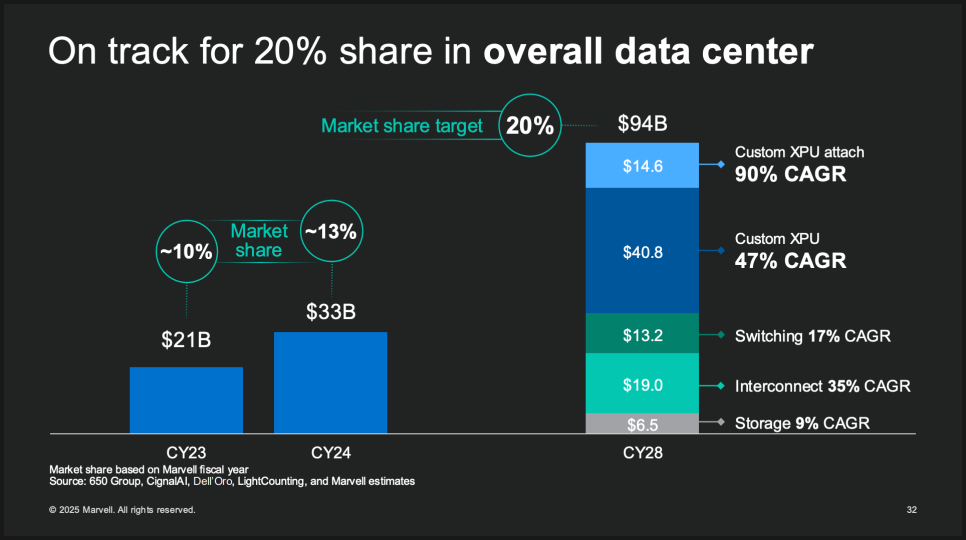 결국 중요한 건 마벨이 AI 인프라 시장에서 얼마나 점유율을 확대할 수 있느냐입니다. 현재 시장 점유율은 약 13% 수준인데, 회사는 2028년까지 20%로 끌어올리겠다는 목표를 세웠습니다. AI 데이터 센터 시장 규모가 940억 달러까지 커질 것으로 예상되기 때문에, 그중 20%를 차지한다면 지금보다 훨씬 큰 기업이 될 수 있습니다.
