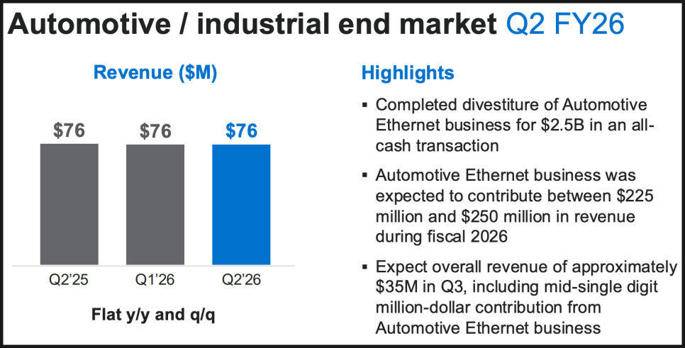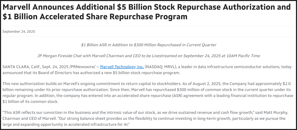 마벨이 자동차 이더넷 사업을 매각한 것도 같은 맥락입니다. 지난 2025년 4월, 마벨은 자동차 이더넷 사업을 인피니온에 25억 달러에 매각했습니다. 전기차와 자율주행의 성장 가능성에도 불구하고, 회사 규모에서 차지하는 비중이 작았기 때문입니다. 오히려 이 매각으로 확보한 자금 25억 달러를 데이터 센터와 AI에 재투자할 수 있게 된 것이죠.