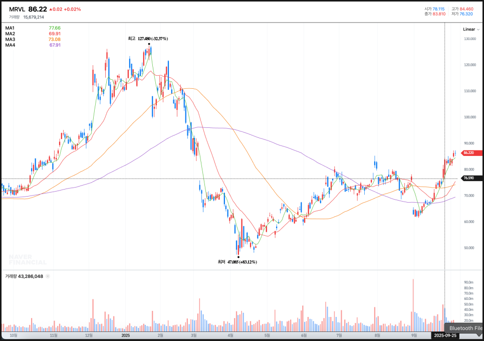 흥미로운 건 주가 차트 흐름과도 맞아떨어졌다는 점입니다. 9월 말 당시 마벨 테크놀로지 주가는 50일선, 100일선, 200일선 같은 주요 이동평균선을 모두 상향 돌파한 상황이었습니다. 기술적 분석에서는 이를 강세 전환의 신호로 해석하죠.