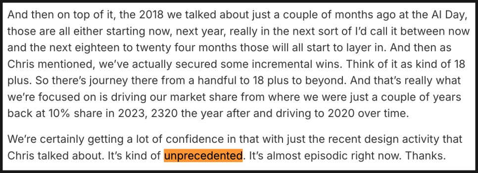 크리스 쿠프만 COO 역시 “전례 없는 수준의 설계 활동이 진행 중”이라고 밝혔습니다. 물론 커스텀 실리콘 특성상 분기별 실적 변동이 있을 수 있다는 점은 인정했지만, 전반적으로 회사가 AI 인프라에서 차지할 위치에 대해 강한 확신을 내비쳤습니다.