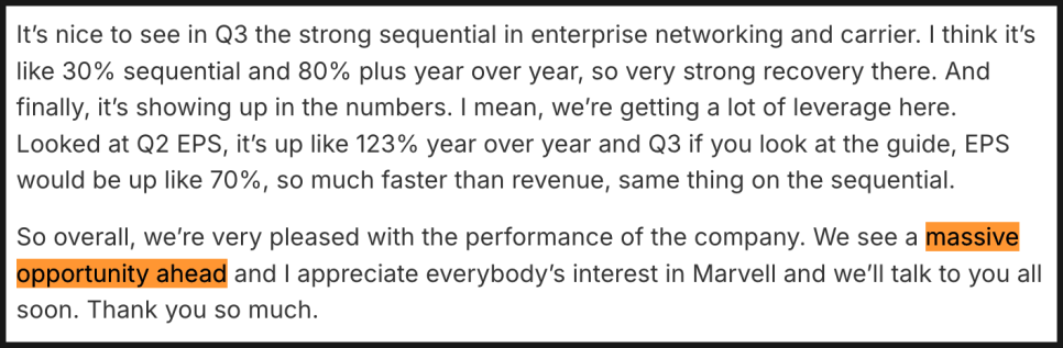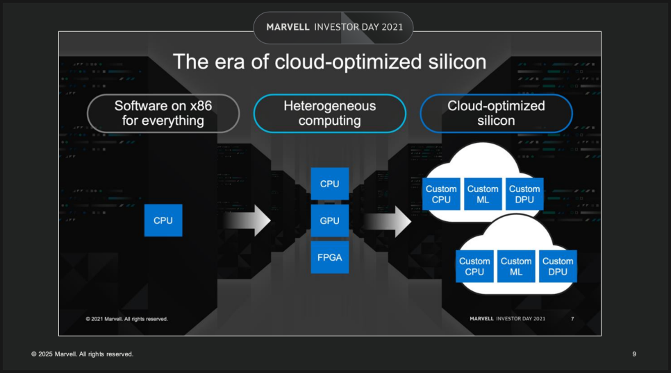 실제로 마벨 테크놀로지는 현재까지 18개의 멀티세대 설계 계약을 따냈고, 50개가 넘는 프로젝트가 파이프라인에 있다고 합니다. 향후 750억 달러 규모의 매출로 이어질 수 있다는 전망도 언급했죠.