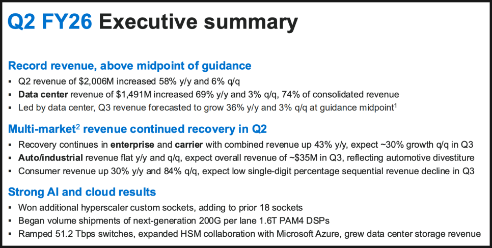 데이터 센터 매출 비중은 74%까지 올라갔으며, 현금흐름도 크게 개선됐습니다. 동시에 자동차 이더넷 사업을 25억 달러에 매각하며 AI와 데이터 센터에 집중하기로 했습니다.