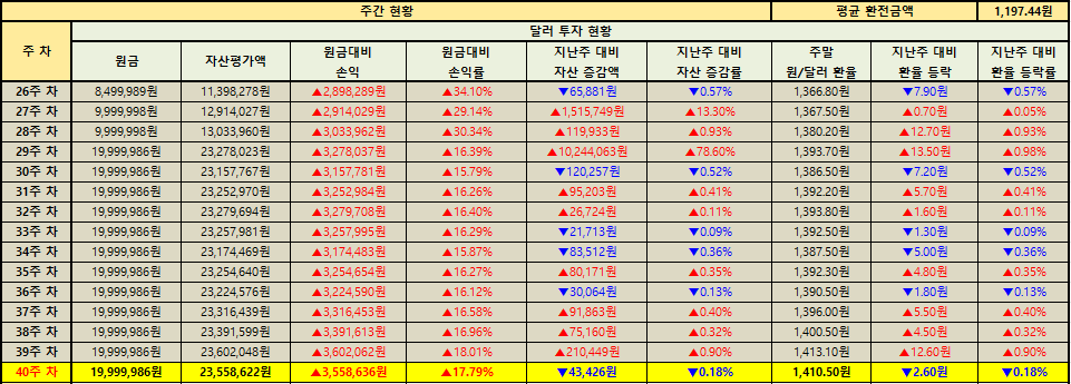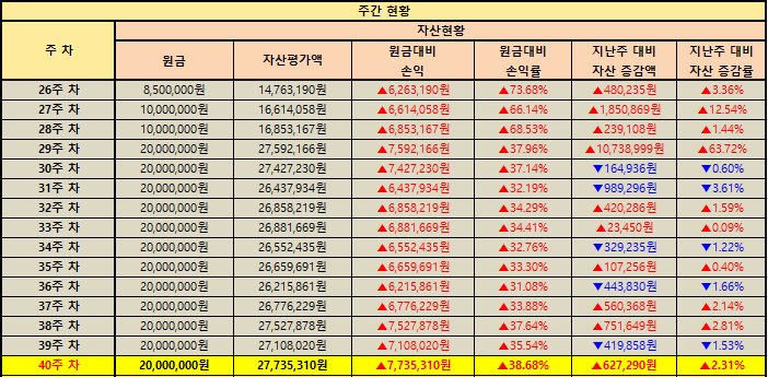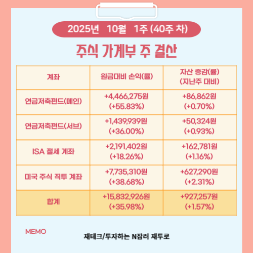 2025년 10월의 첫 주, 40주 차 주식 가계부를 정리해 보았습니다. 이번 주는 전반적으로 시장이 안정적인 반등 흐름을 이어가며 각 계좌별로 고르게 긍정적인 성과를 보인 한 주였습니다.