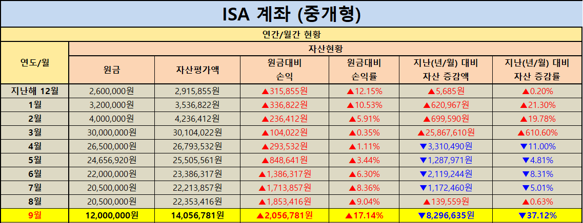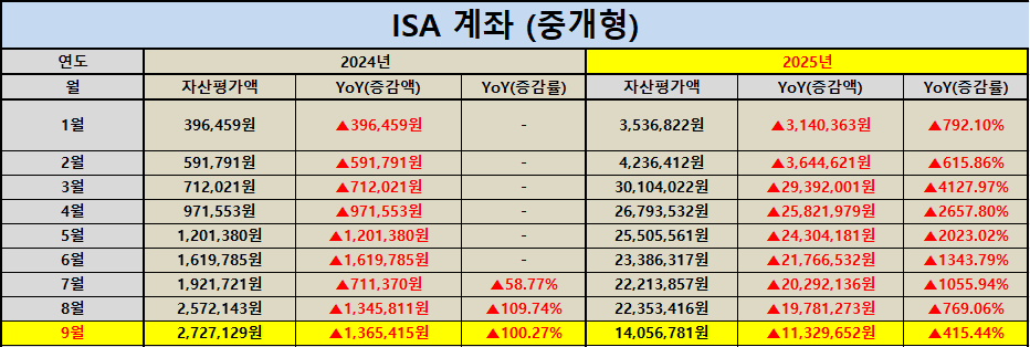 2025년 9월의 주식 가계부를 정리해 보았습니다. 이번 달은 전체 자산이 전월 대비 다소 줄어든 모습이지만 이는 시장 조정이 아니라 생활 목적의 일시적 자금 이동 때문이었습니다. 학원 등록비와 자동차 관련 지출 등 목돈이 필요해 ISA 계좌에서 일부 금액을 인출했기 때문인데요, 앞으로는 이러한 일시적 자금 인출이 없을 예정이라 투자 구조상 불안 요인은 전혀 없습니다. 오히려 전체 계좌의 밸런스를 다시 점검하고 각 자산의 역할을 명확히 하는 계기가 된 한 달이었습니다.