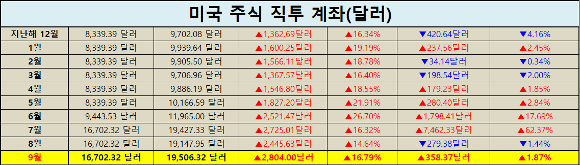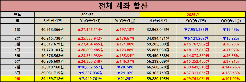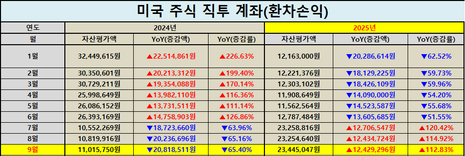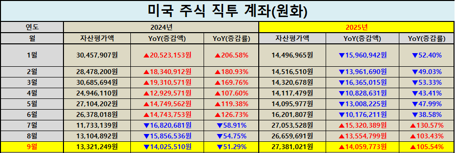 전체 계좌를 합산하면 9월 기준 총자산평가액은 59,220,795원으로 전월 대비 –7,141,953원(–10.76%)이지만 원금 대비 수익은 +15,220,795원(+34.59%)으로 여전히 안정적인 수익률을 기록 중입니다. 전년 동기 대비로 보면 +29,761,084원(+101.02%)의 자산 성장을 이뤘으며 이는 장기 복리와 환율 효과가 맞물린 결과입니다. 단기적으로는 현금 유출이 있었지만 포트폴리오 전반의 수익 구조는 탄탄히 유지되었습니다.