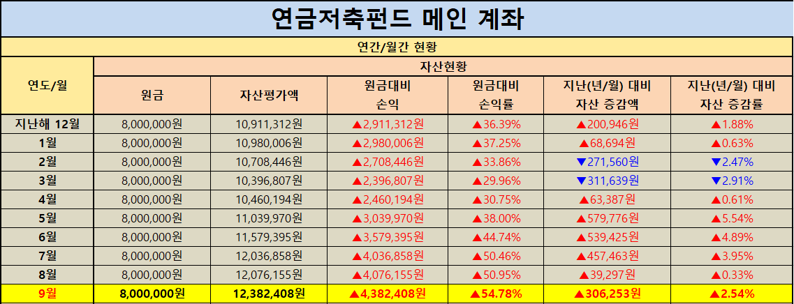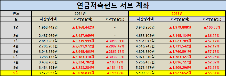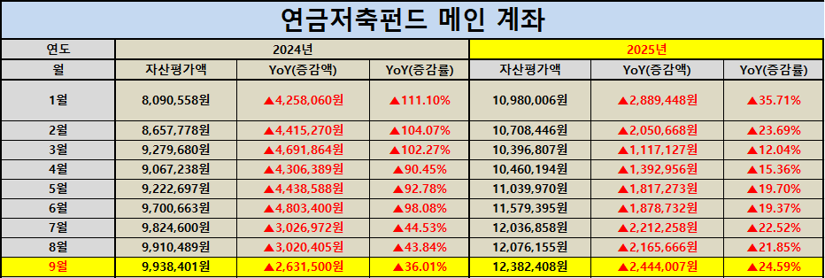 연금저축펀드 메인 계좌는 9월 기준 원금 대비 +4,382,408원, 수익률 +54.78%로 다시 한번 안정적인 상승세를 보여주었습니다. 전월 대비 자산 증가액은 +306,253원으로 소폭 상승이지만 12개월 연속 플러스 흐름을 이어가고 있다는 점이 더욱 의미 있습니다. 서브 계좌 또한 원금 대비 +1,400,585원, 수익률 +35.01%를 기록하며 메인과 함께 꾸준히 자산을 불려가고 있습니다. 두 계좌 모두 꾸준한 적립식 매수와 배당 재투자가 복리로 이어지는 전형적인 장기 투자 흐름을 잘 보여주고 있습니다.