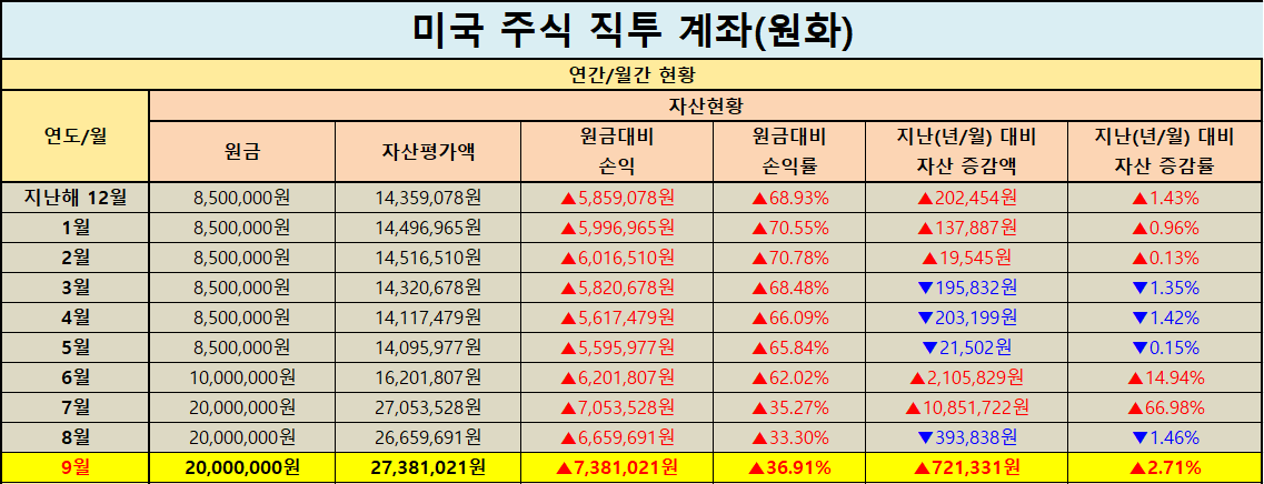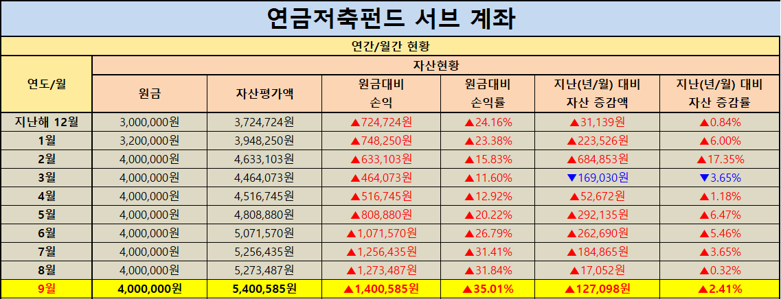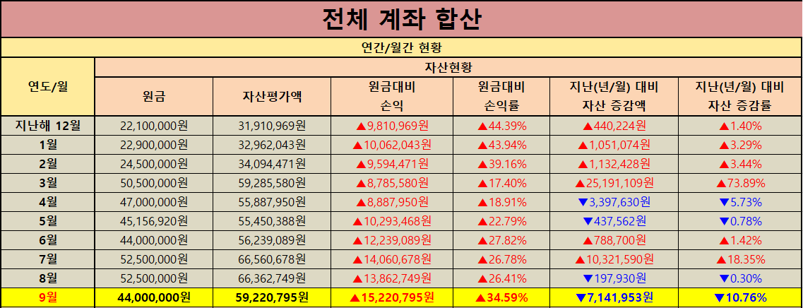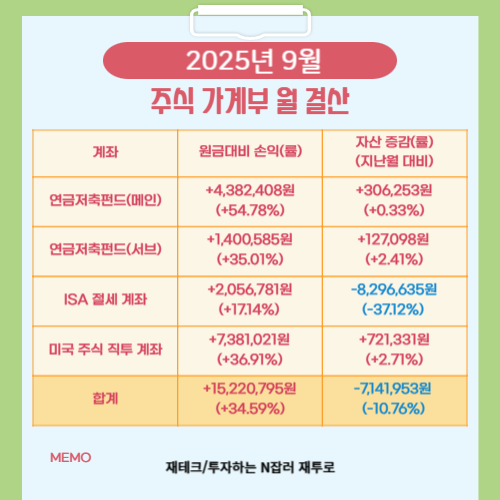 이달의 결산을 정리하자면 일부 계좌에서 자금 이동이 있었음에도 장기 투자 기반은 흔들림이 없었고 연금저축과 해외직투 자산의 안정성이 다시 한번 입증된 한 달이었습니다. 자금의 유출이 아닌 구조적 점검의 시기로 보고 있으며 10월부터는 다시 평상 운용 페이스를 이어갈 예정입니다. 변동성에 흔들리지 않고 원칙적인 투자 흐름을 유지하는 것이 결국 복리의 출발점이라 생각합니다.