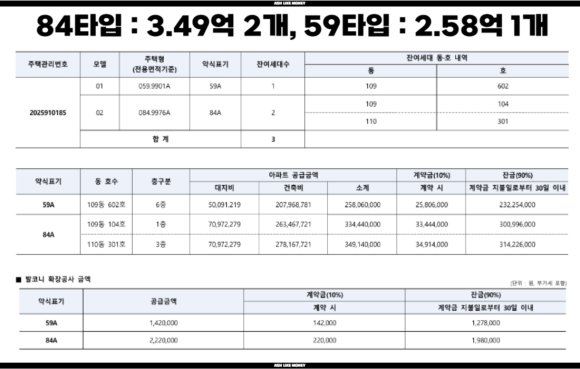 59A타입의 경우 분양가가 2.58억이고 3층 109동 602호, 84A타입의 경우 분양가 3.49억 109동 104호, 110동 301호로 각각 1개씩이다. 계약금은 각각 10%, 잔금 90%이다. 59타입의 계약금은 25,806,000원이며 84타입의 경우 109동 104호는 33,444,000원이고 110동 301호는 34,914,000원이다.