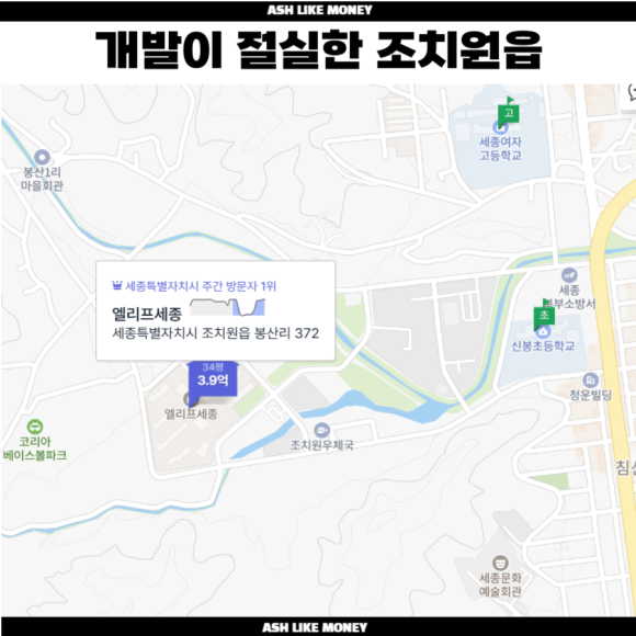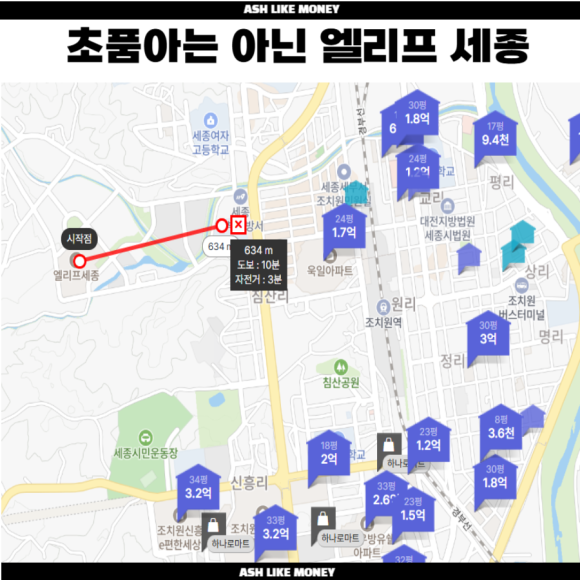 엘리프 세종은 세종시 조치원읍 봉산리 379번지 일대에 위치한다. 주소를 보면 알듯이 읍, 리라 자연친화적 환경이다. 하지만 우리는 알고 있다. 이렇게 자연친화적 환경이라 홍보하는 곳은 단연코 아직 개발이 덜 되어 많이 부족하다는 것을. 엘리프 세종은 아쉽게도 우리가 많이 알고 있는 행정중심복합도시에 위치하지 않는다. 조치원역과 홍익대학교 세종캠퍼스가 가까워 번듯한 신도시 느낌은 아니다. 조치원에 위치한 유일한 신축으로 주변에 상가가 없고 초등학교도 멀리 있는 편이다.