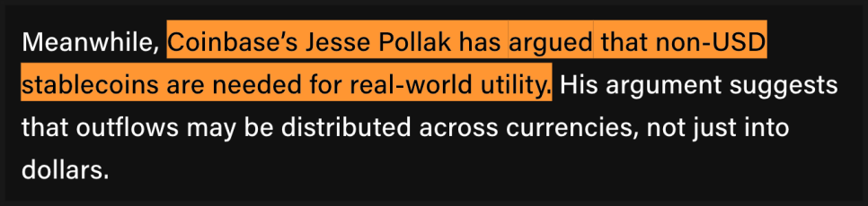 한편, 코인베이스(Coinbase) 의 제시 폴락(Jesse Pollak)은 “달러 외 다른 통화 기반의 스테이블코인이 실물경제에서 더 큰 유용성을 가질 수 있다”며, 향후 유출 자금이 비(非)달러 스테이블코인으로 분산될 가능성도 있다고 주장했습니다.
