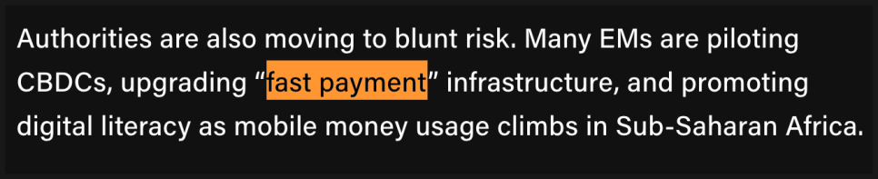 이 흐름에 대응하기 위해 여러 신흥국 정부는 중앙은행 디지털화폐(CBDC) 발행을 시범 운영 중이며, ‘패스트 페이먼트(Fast Payment)’ 인프라를 구축하고 있습니다. 또한 모바일 머니(Mobile Money) 사용이 급증하고 있는 사하라 이남 아프리카 지역을 중심으로 디지털 금융 교육도 확대되고 있습니다.