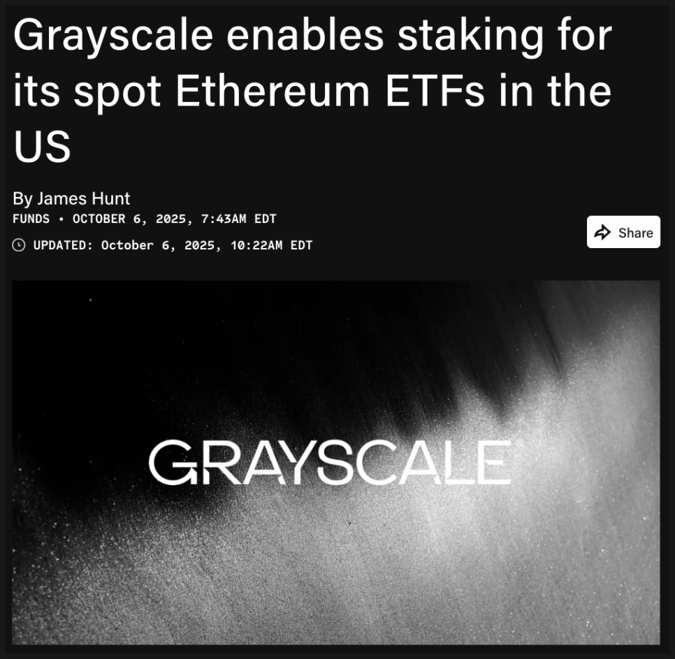 비트코인이 주목받는 사이, 이더리움(ETH)과 솔라나(SOL)는 또 다른 변화를 이끌고 있습니다. 세계 최대 디지털 자산 운용사인 그레이스케일(Grayscale)이 미국 내에서 처음으로 스테이킹(staking) 기능이 포함된 현물 이더리움 ETF를 출시했습니다.