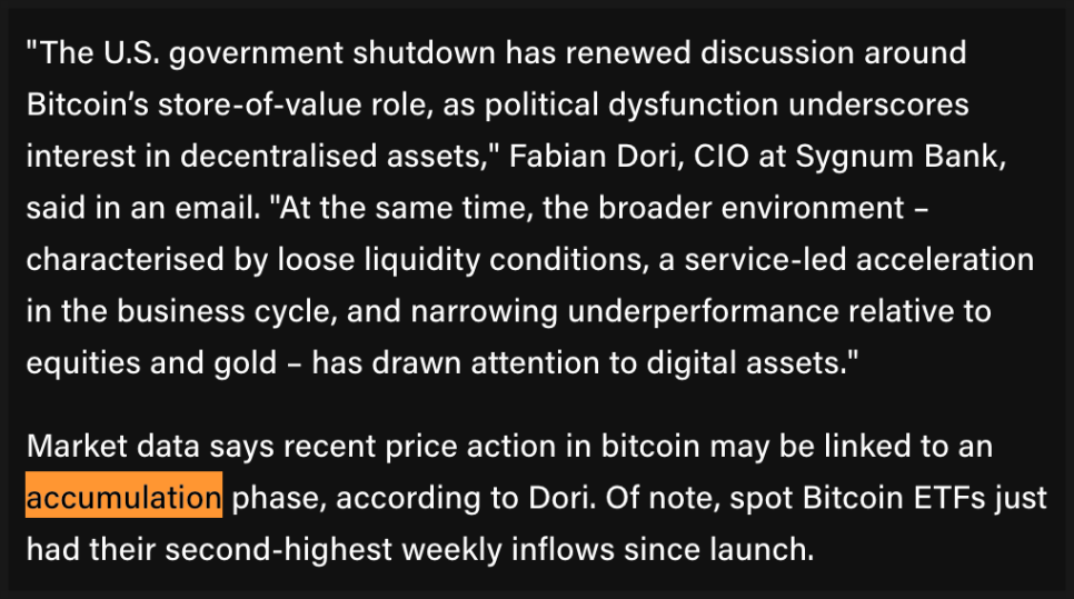스위스에 본사를 둔 글로벌 암호화폐 은행 시그눔(Sygnum Bank)은 이번 상승이 ‘축적(Accumulation) 단계’의 결과라고 분석했습니다. 즉, 대형 투자자들이 조용히 비트코인을 꾸준히 매수해왔고, 그 결과로 최근 가격이 폭발적으로 상승했다는 뜻입니다.